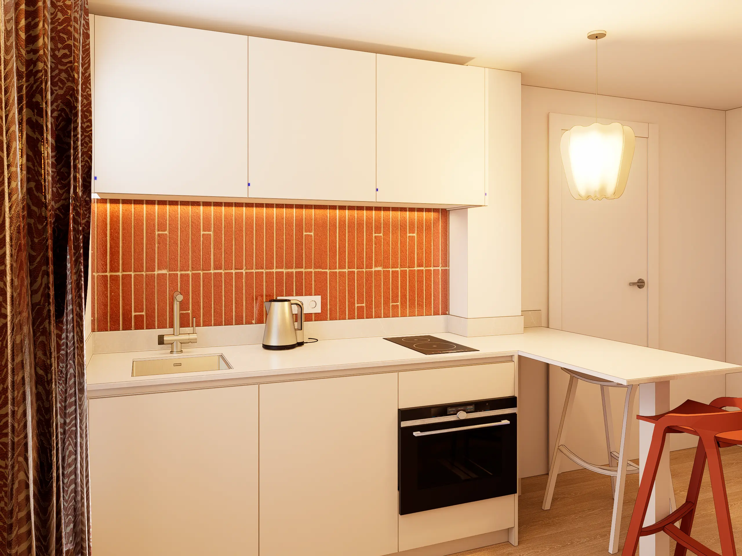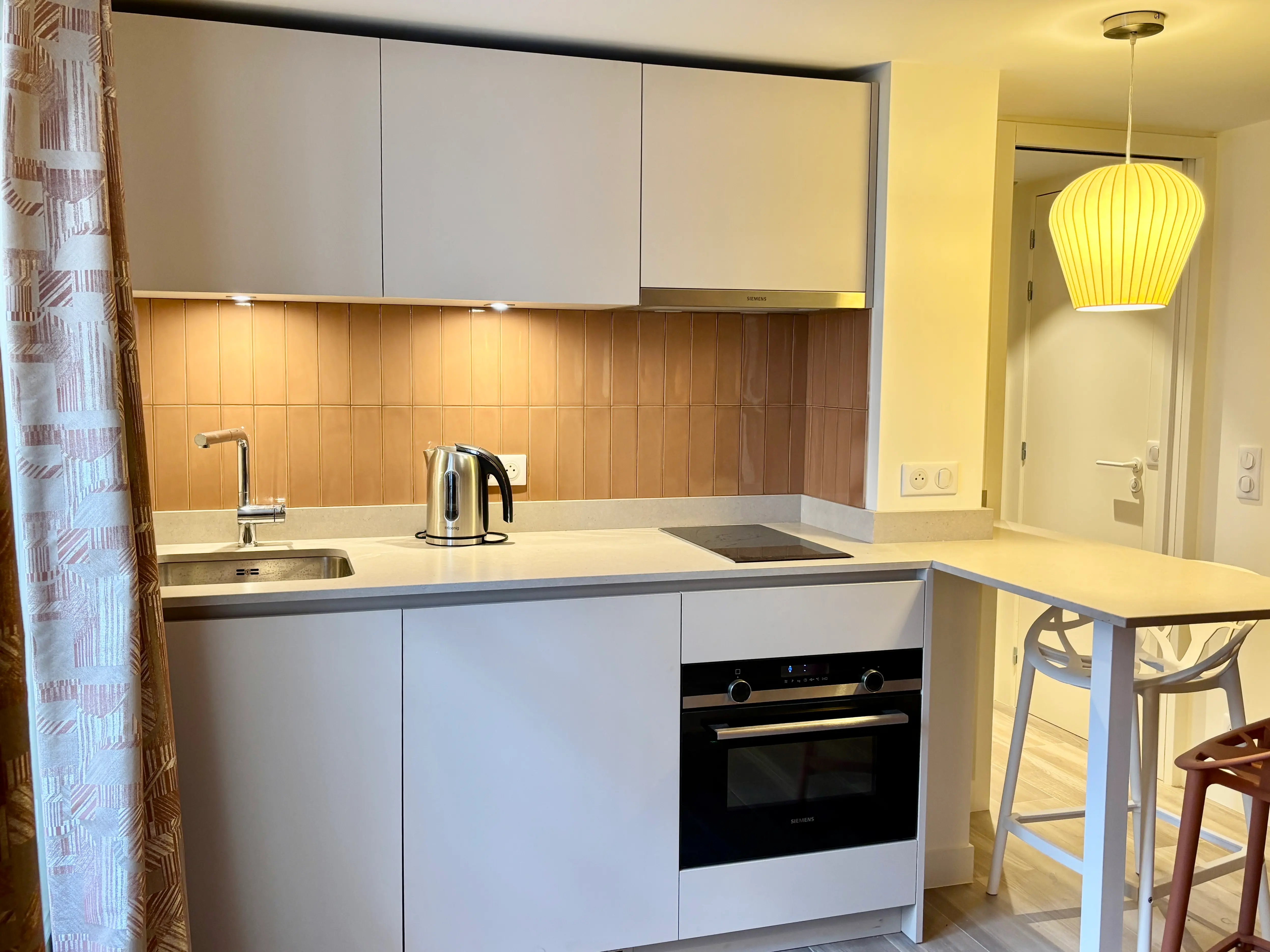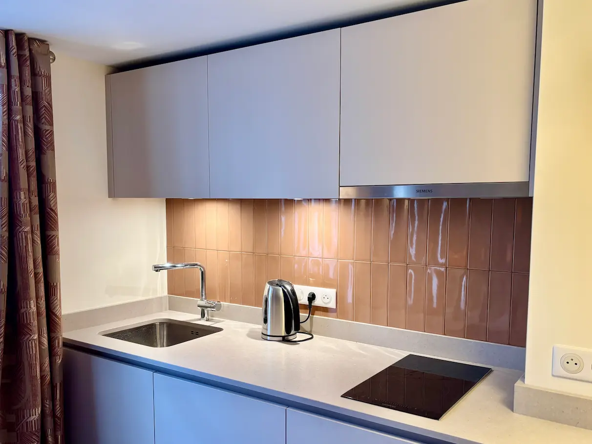 Le plan de travail en Silestone Royal Reef apporte une lumière subtile à l’ensemble tout en assurant une grande résistance à l’usage quotidien. Ce matériau, à la fois élégant et facile d’entretien, est idéal pour cet espace compact et fonctionnel.