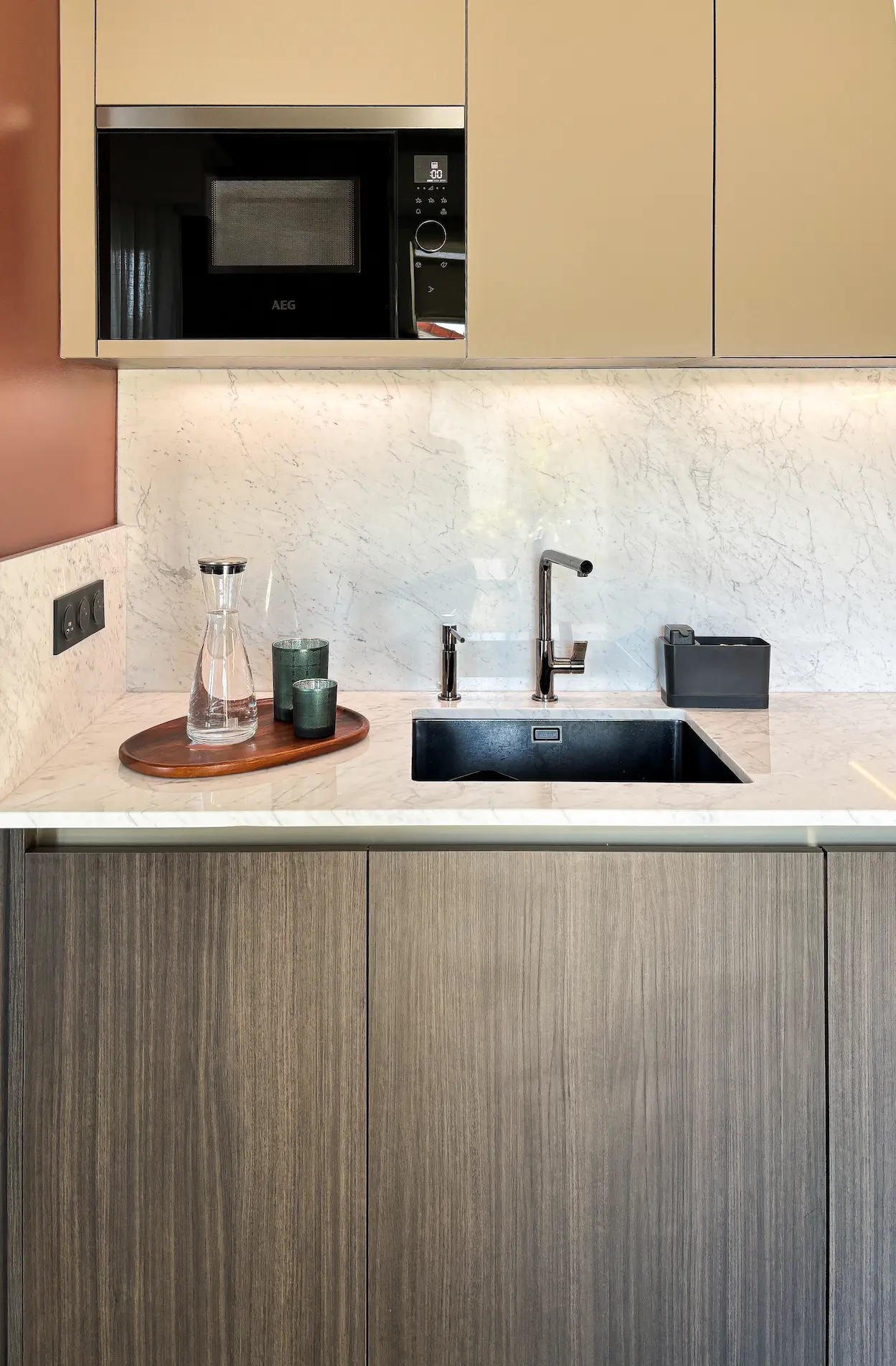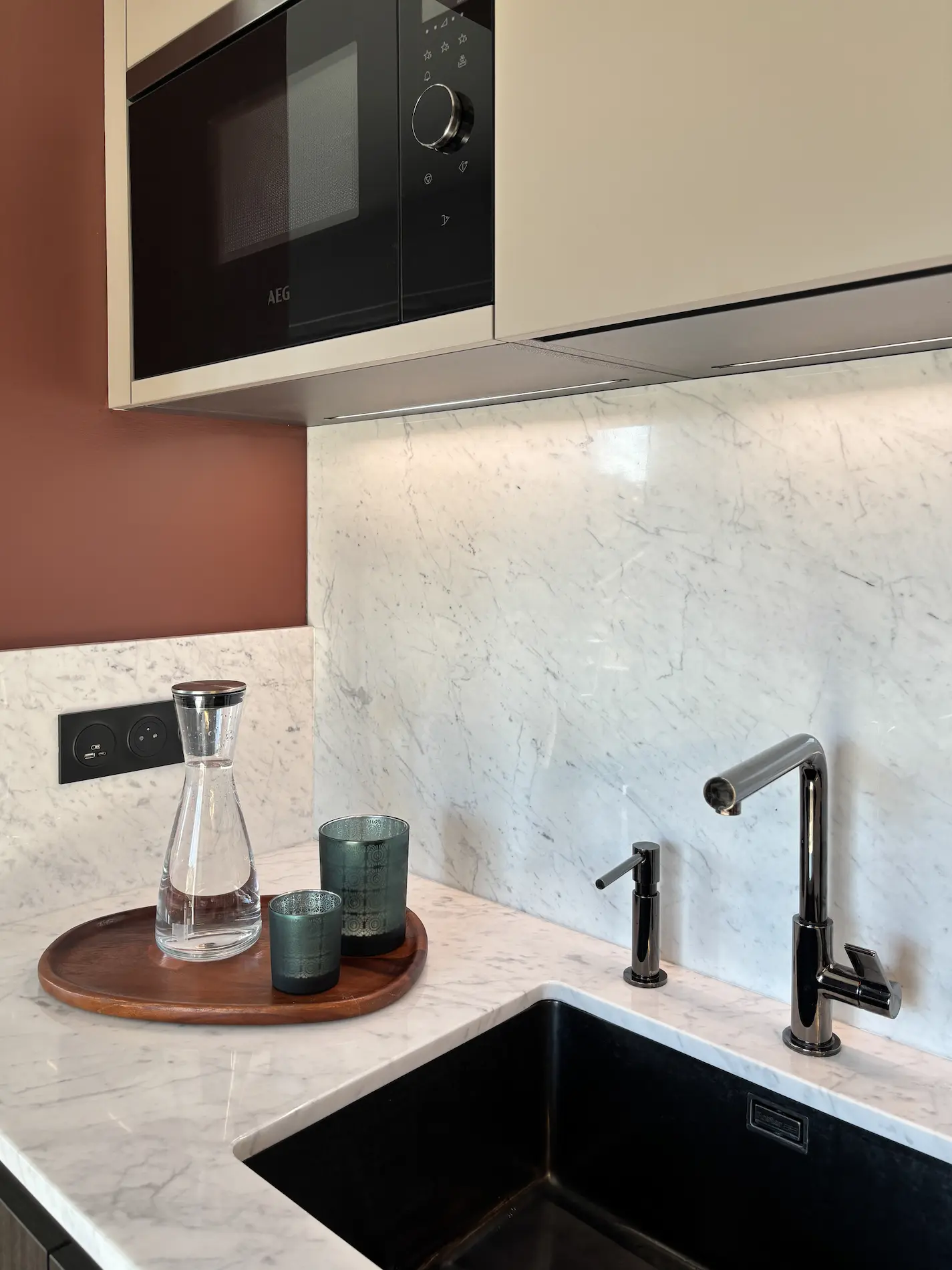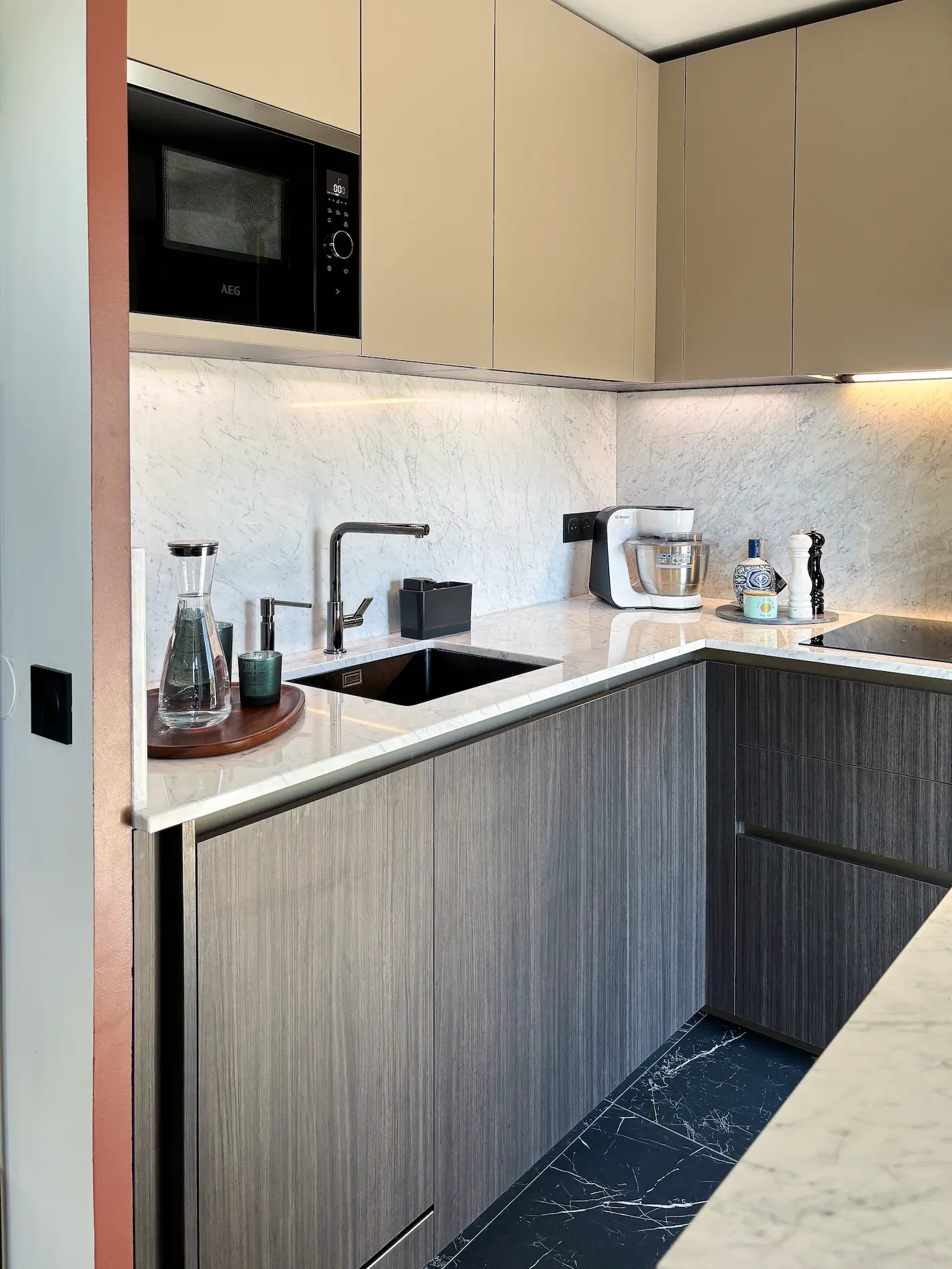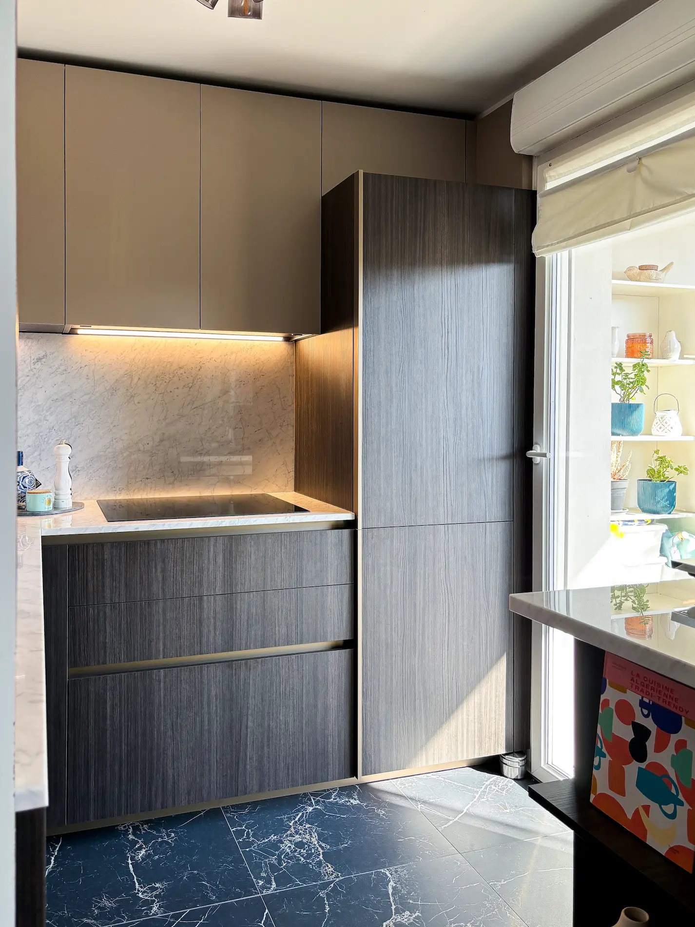 Le plan de travail en marbre de Carrare, matériau noble par excellence, confère à cette cuisine compacte une véritable dimension haut de gamme, tout en renforçant la luminosité de l’espace.
