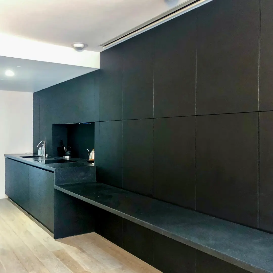 Entièrement conçue et réalisée par Dimi Interior Design, cette cuisine design se développe en un linéaire épuré, où chaque élément trouve naturellement sa place. Les façades en Fenix noir mat, au toucher soyeux et à l’aspect ultra mat, renforcent l’esthétique minimaliste et architecturale du projet.