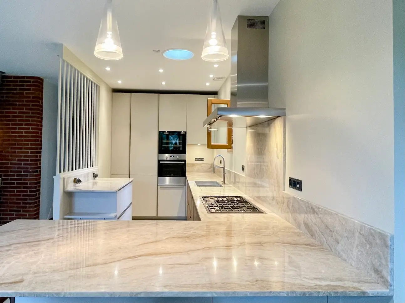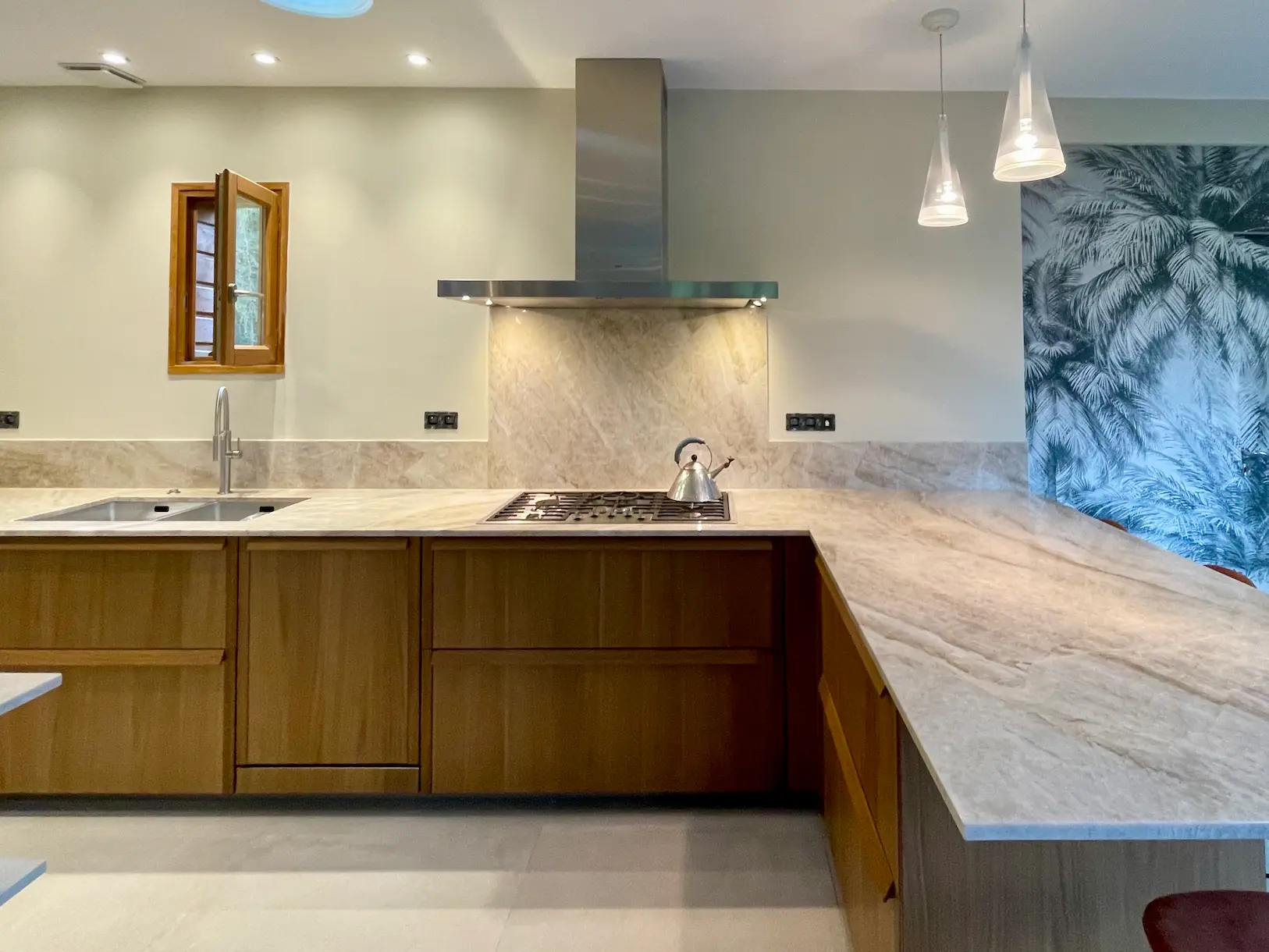 Le plan de travail en quartzite Taj Mahal, véritable pièce d’exception, sublime l’ensemble par ses nuances délicates et sa profondeur minérale. À la fois esthétique et extrêmement résistant, il renforce le caractère haut de gamme de cette cuisine équipée, pensée pour durer.
