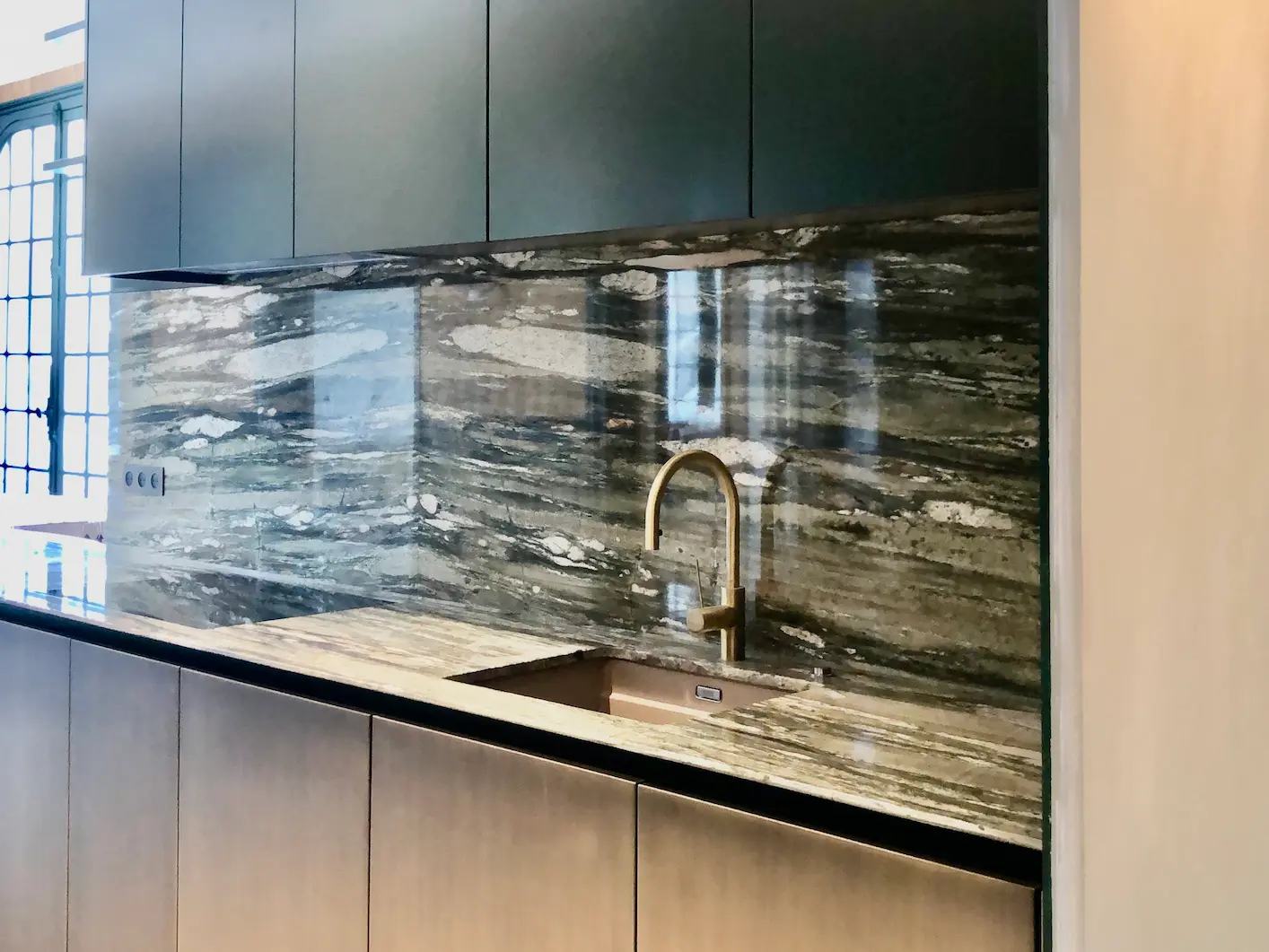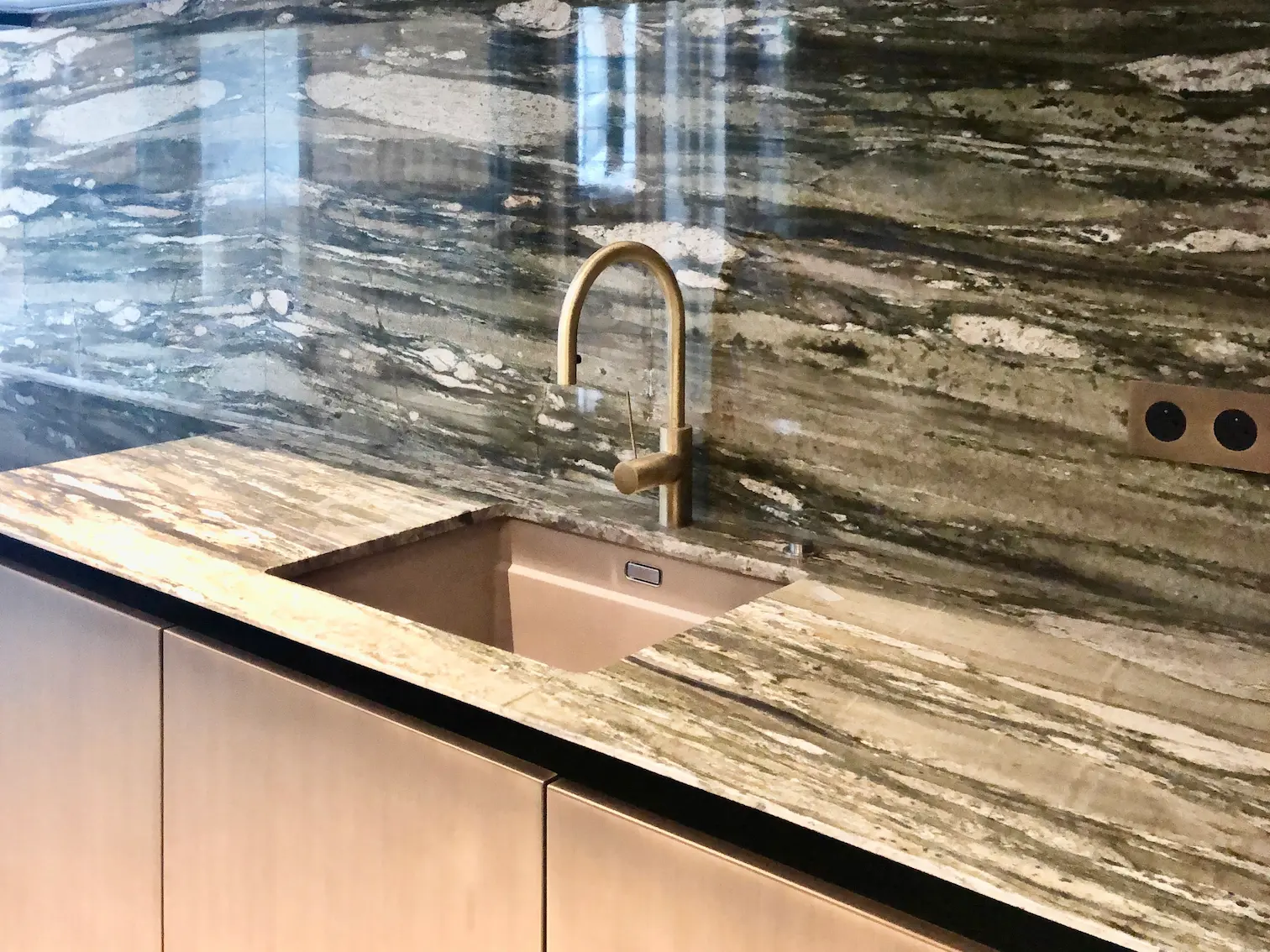 Le plan de travail en quartzite naturel Tropical Fashion, aux veinages spectaculaires, devient une véritable pièce maîtresse du projet.
