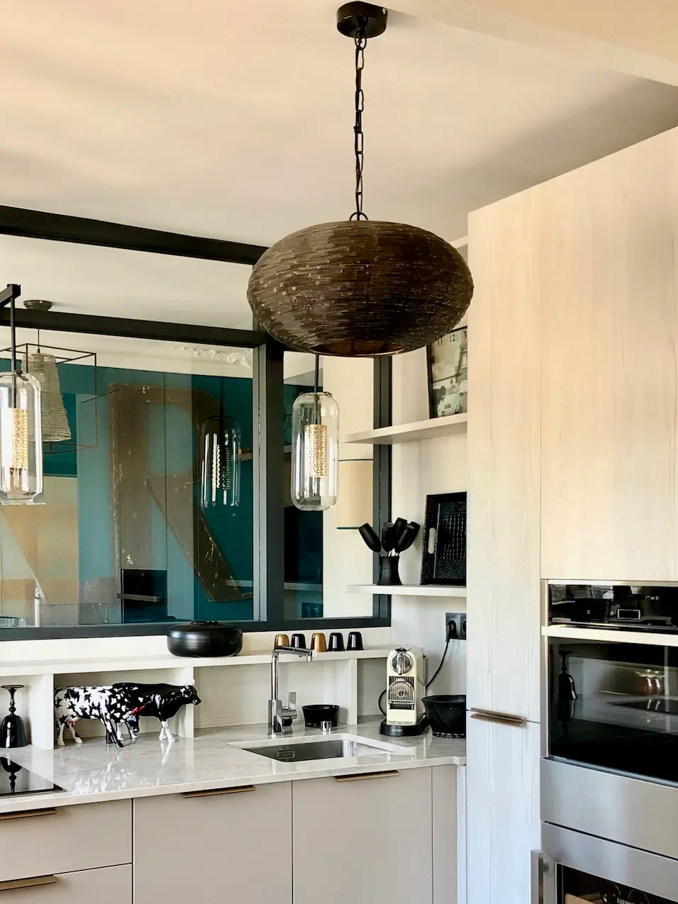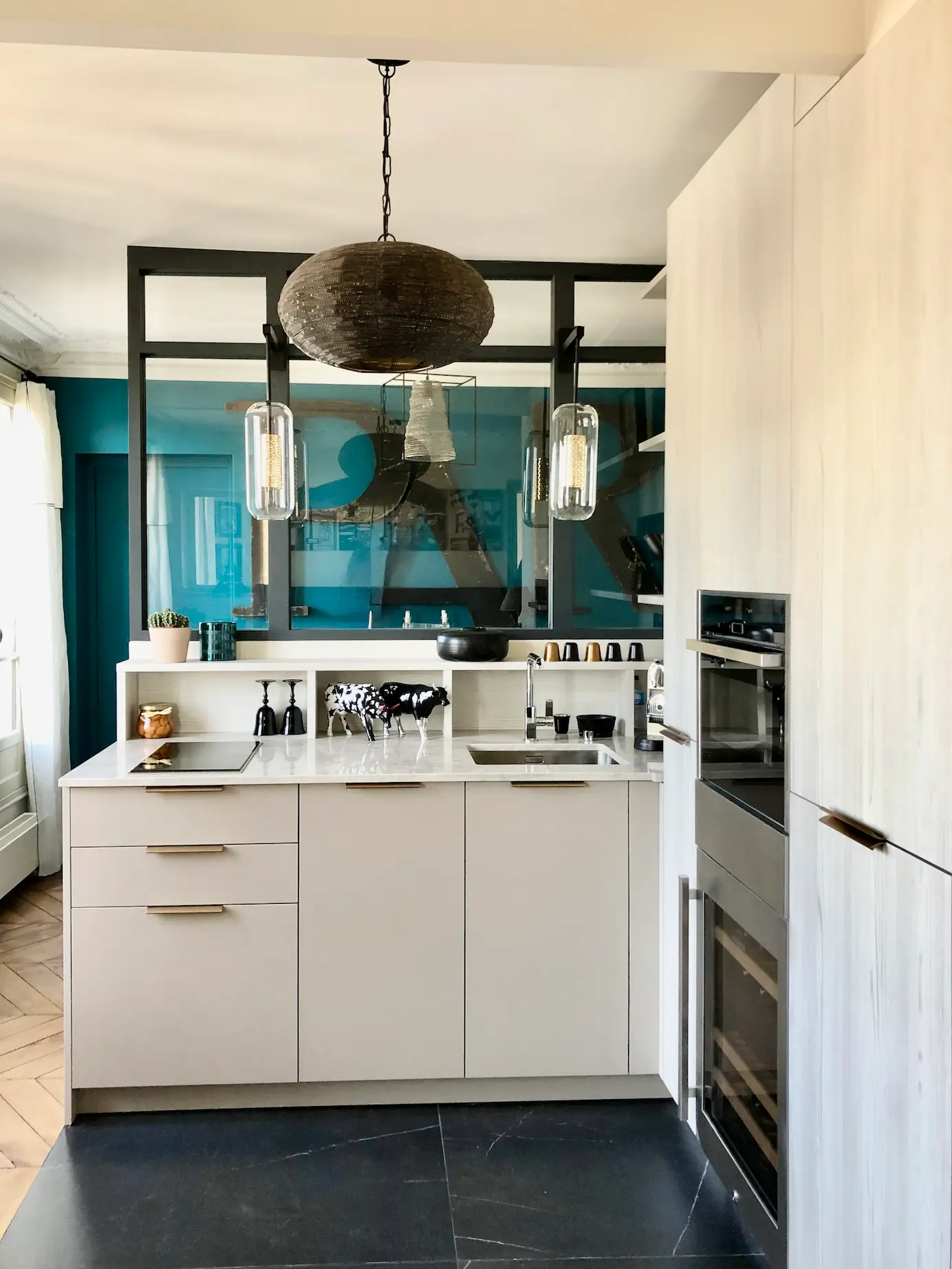 Pensée sur mesure, cette cuisine s’intègre parfaitement dans l’architecture existante, notamment grâce à sa relation avec la verrière qui ouvre les perspectives et accentue la profondeur de l’espace.