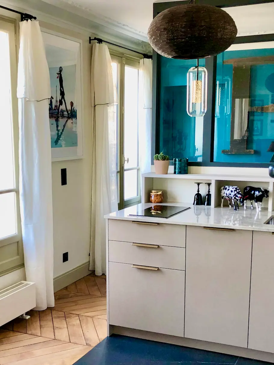 Au cœur de la rue du Cherche-Midi à Paris, ce pied-à-terre s’organise autour d’une cuisine haut de gamme pensée comme le véritable point central de l’appartement.