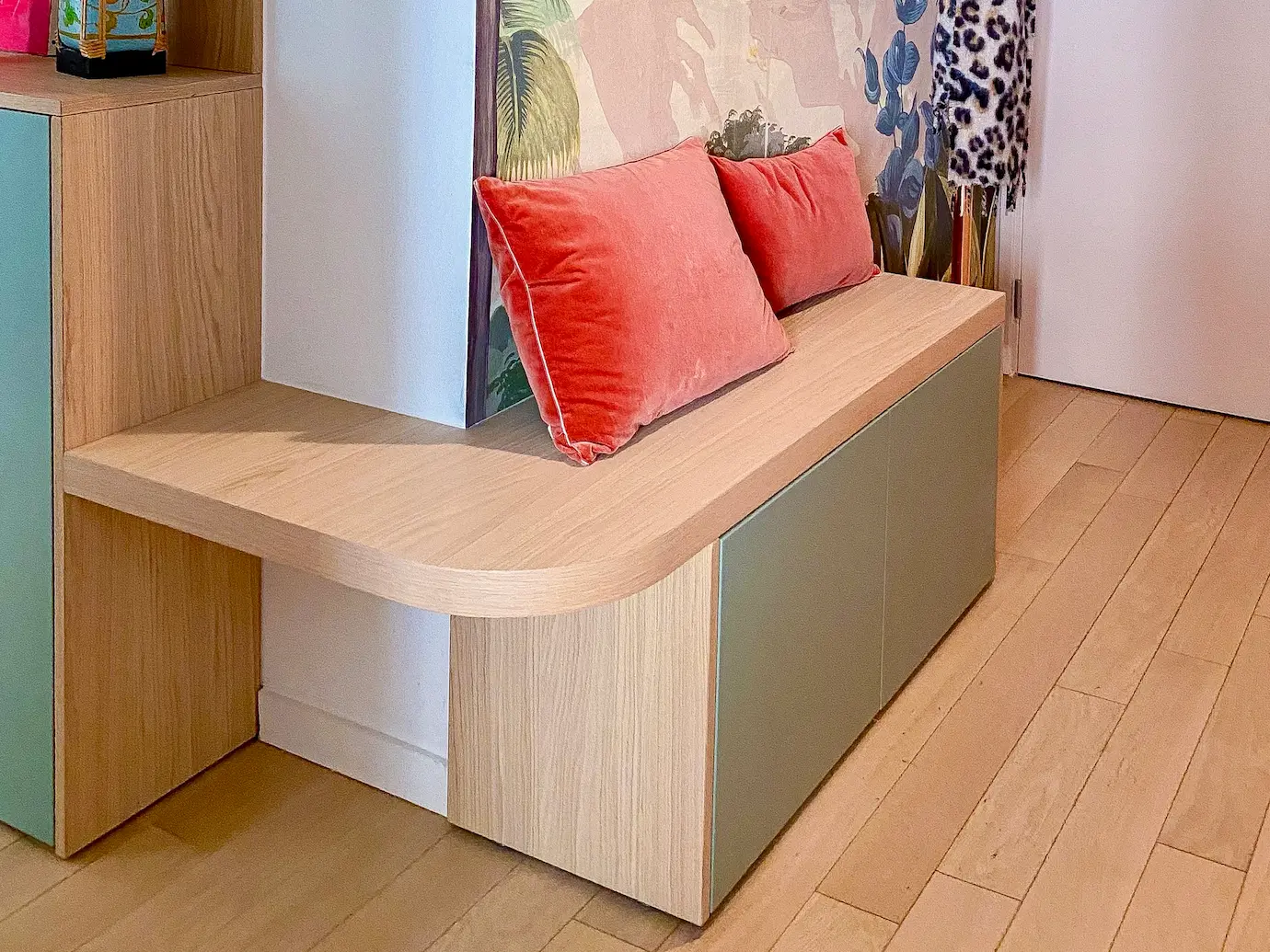 • Mobiliers LOGOS sur mesure : Créés pour s’intégrer avec fluidité dans l’espace, ces meubles se distinguent par leur design minimaliste et leur ergonomie.