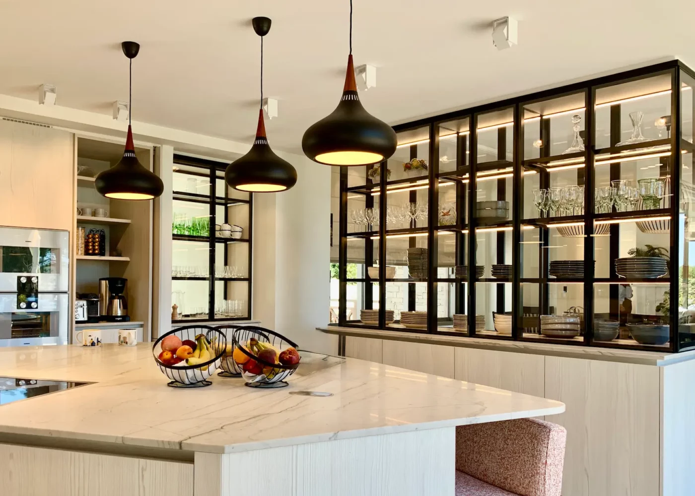 Par ailleurs, le plan de travail en Quartzite du Brésil donne à l’ensemble une profondeur minérale. Quant au four V-Zug, il s’intègre parfaitement avec discrétion dans cette composition résolument contemporaine.